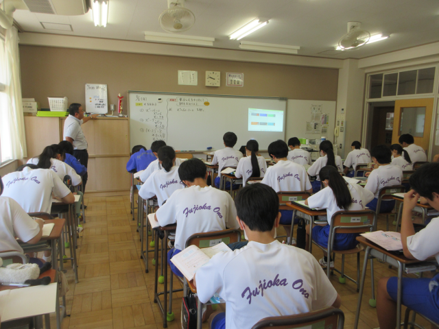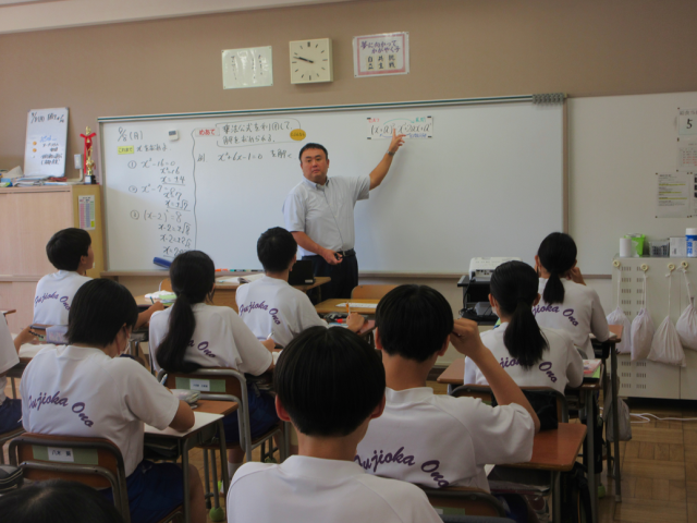 9月8日(月)授業の様子(3年3組 数学) 公開日 2025/09/08 更新日 2025/09/08 できごと 乗法の公式を利用して解を求めました。式を展開したり、因数分解したり相互関係を理解することで、乗法公式の理解が深り、式の応用につながります。既習事項を思い出しながら、集中して学習していました。