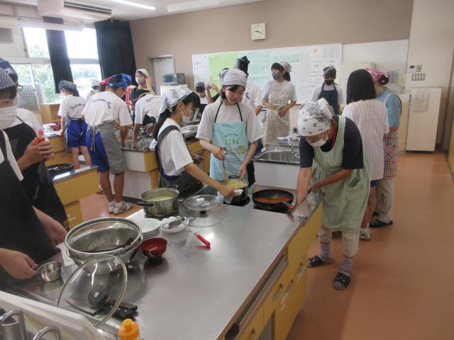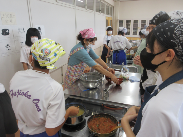9月9日(火)授業の様子(2年2組 家庭科) 公開日 2025/09/09 更新日 2025/09/09 できごと 調理実習に取り組みました。メニューはミートソーススパゲッティとかきたま汁です。班で協力しながらミートソースを作ったり、パスタを茹でたりしました。分量や時間をしっかり測っていたので、上手にできたことと思います。今日も「おのハンモック」の方々に支援をしていただきました。