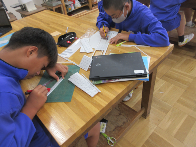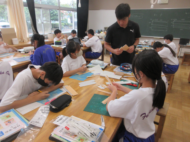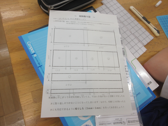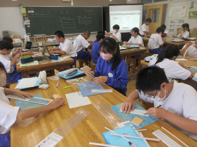 9月12日(金)授業の様子(1年1組 技術科) 公開日 2025/09/12 更新日 2025/09/12 できごと 構想した木工製作品が、与えられた材料で製作できるか、材料取り図を書き、発泡スチロールで試作品をつくっています。作品のイメージが膨らんできたことと思います。 +1