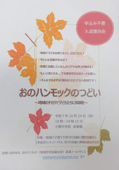 午後、小野中学校を会場に第3回学校運営協議会が開催されました。まずは授業参観を行い、その後、熟議に入りました。令和7年度全国学力学習状況調査の結果から、小野小中学校の子供たちのよさと課題、改善策について熟議を行いました。また、10月に予定している「おのハンモックのつどい」や改定を進めている「アクションプラン2025」について検討を行いました。次回は10月24日(金)に「おのハンモックのつどい」を開催予定です。