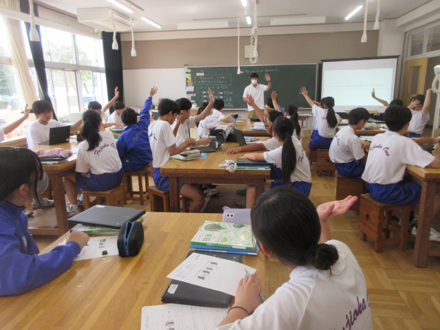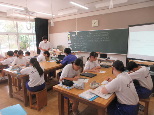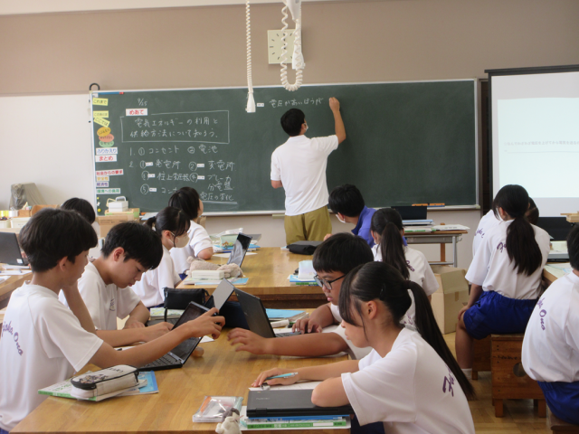 電気エネルギーの利用と供給方法について学んでいます。わざわざ電圧を上げてから電気を送る理由を考えました。送電・配電の技術の工夫や特徴をまとめていきました。積極的に挙手をして発言しています。