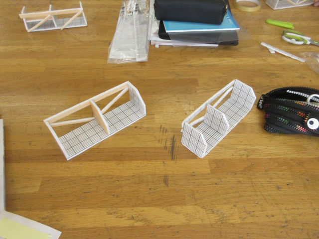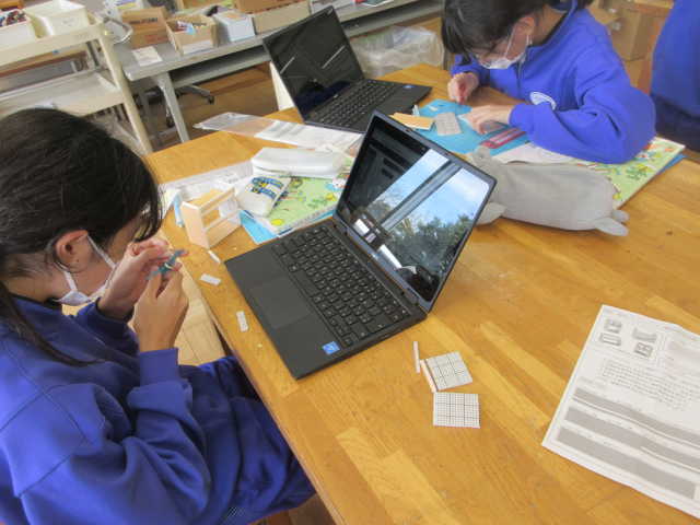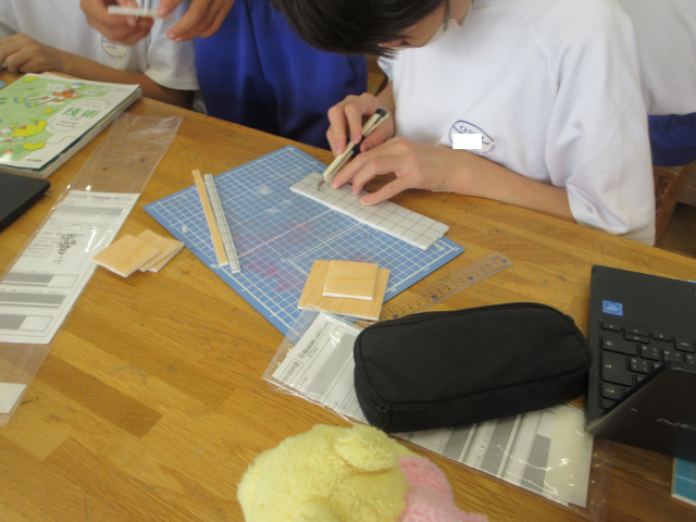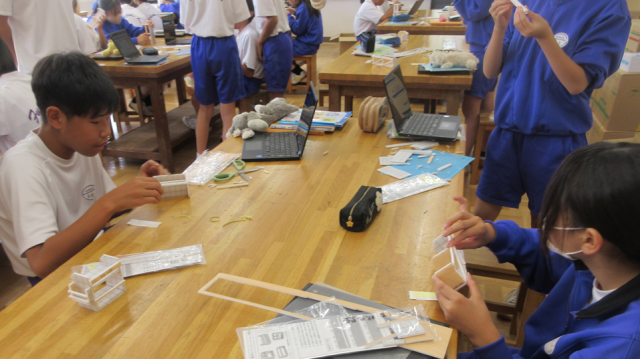 シミュレーション模型づくりで設計・製作の事前学習を行っています。木材加工で自分の作りたものについて、縮尺3分の1の大きさで試作を行いました。寸法や作りやすさ、改良点について確認しながら作業を進めていました。