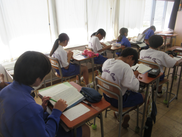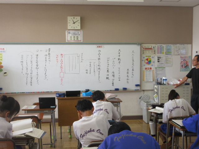 10月2日(木)授業の様子(1年2組 国語) 公開日 2025/10/02 更新日 2025/10/02 できごと 1年生の国語も戦争を題材にした小説を題材に学習をしています。米倉斎加年の「大人になれなかった弟たちに…」を読んだ感想を原稿用紙にまとめました。生徒は、戦争を憎み、平和を願う作者の気持ちを読み取っていました。