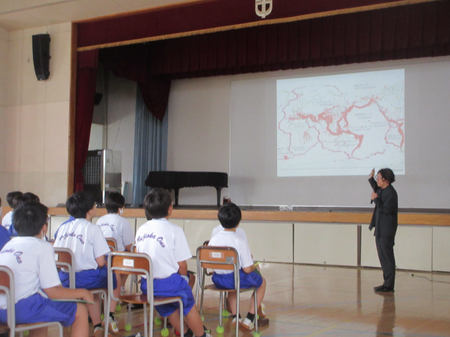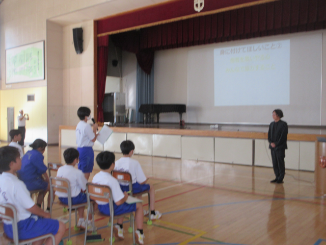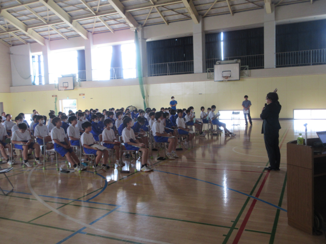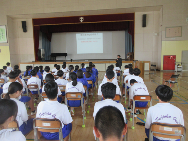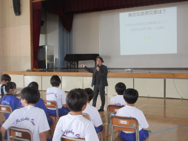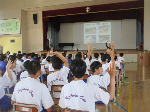 5校時、1年生を対象に防災教育講演会を行いました。群馬大学大学院教授、金井昌信先生を講師に、災害発生時に適切な行動をとるにはどうすればいいか、クイズ等を交え、わかりやすく説明していただきました。特に小野地区はハザードマップで水害の危険性が高いことを示しながら、風水害から身を守る方法や身に付けたい力等について示していただきました。小野中学校では、今後も計画的に防災教育を進めていきます。