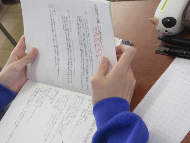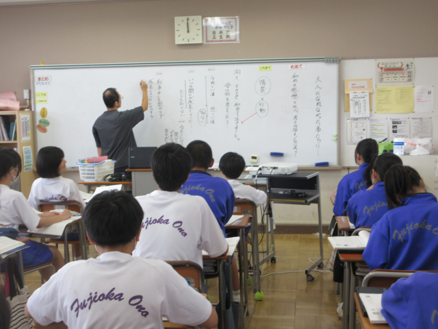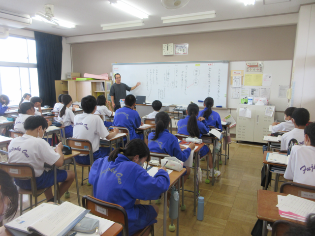 10月7日(火)授業の様子(1年1組 国語) 公開日 2025/10/07 更新日 2025/10/07 できごと 「大人になれなかった弟たちに…」の読解です。母親が息子を棺に入れる際、初めて泣いた理由を考えました。ノートを読み返し、登場人物の行為の理由を考えながら、読み深めています。