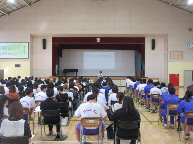 10月8日(水)3学年進路保護者会 公開日 2025/10/08 更新日 2025/10/08 できごと 3学年が進路保護者会を行いました。たくさんの保護者の皆様にも来校していただき、親子で情報を共有です。3年の先生方から説明される各高校の入学選抜の情報や進路に関するこれからの流れ、願書・出願方法等について真剣に聞き入っていました。進路実現に向けて、もう一段ギアチェンジです。 +1