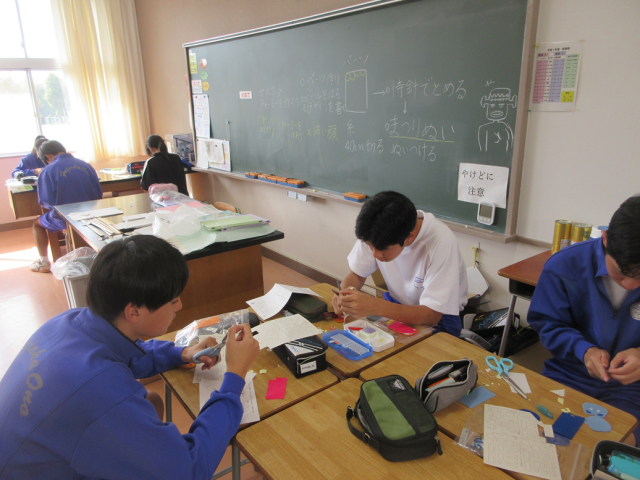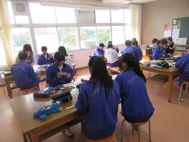 10月15日(水)授業の様子(3年2組 家庭科) 公開日 2025/10/15 更新日 2025/10/15 できごと フェルトマスコット・チャーミーの制作です。キャラクターの表情を考えながら、フェルトを縫い合わせています。個性的なキャラクターが出来上がりそうです。