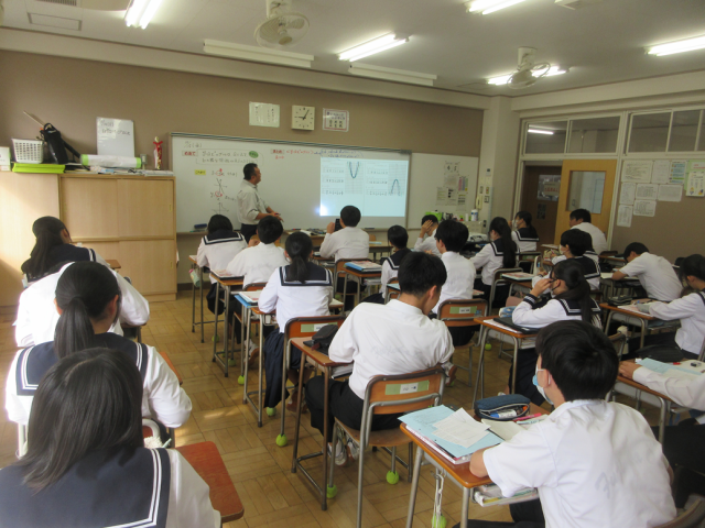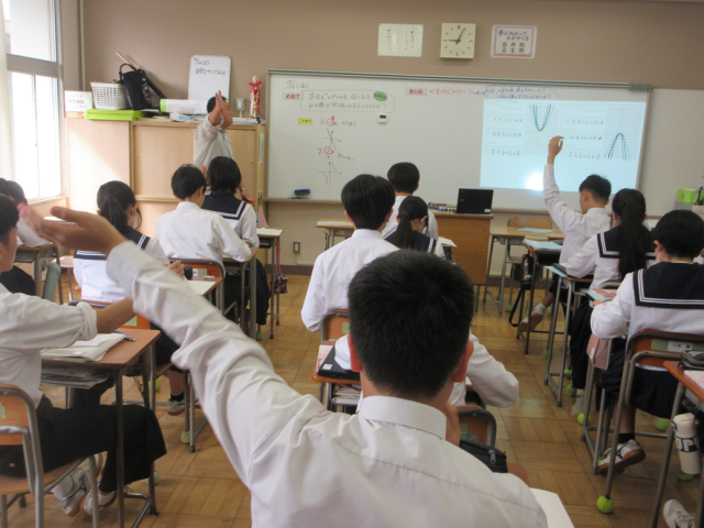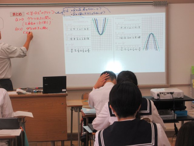 10月15日(水)授業の様子(3年3組 数学) 公開日 2025/10/15 更新日 2025/10/15 できごと y=aX²のグラフについての学習です。aの値によるグラフの特徴について、考えました。二次関数にも慣れ、生徒は上手にグラフを書いています。特徴もしっかり説明することができていました。