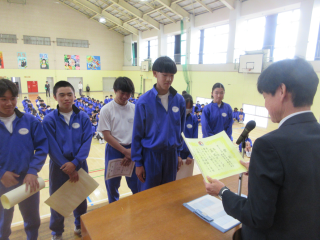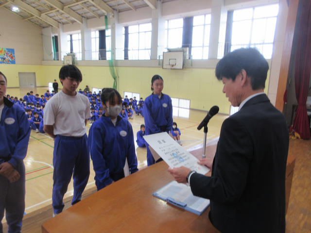 11月5日(水)表彰 公開日 2025/11/05 更新日 2025/11/05 できごと 今日の表彰は、「県中体連新人大会」「藤岡多野中体連秋季大会」「市民ソフトテニス大会」「西毛地区新人水泳大会」「県スポーツ少年団中学生柔道交流大会」「東日本選抜大会群馬支部予選」「藤岡多野英語弁論大会」「読書感想文コンクール」でした。たくさんの生徒が表彰を受けました。表彰されるにふさわしい返事、立ち振る舞いで賞状を受けていました。