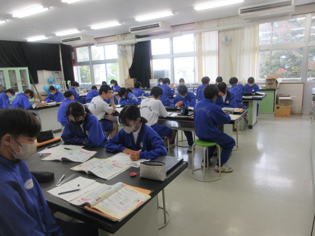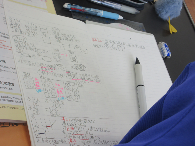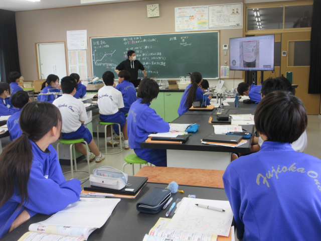 11月6日(木)授業の様子(1年3組 理科) 公開日 2025/11/06 更新日 2025/11/06 できごと 物質の状態変化について学んでいます。沸点の違う混合物の液体を分離させる方法について考えました。混合物を加熱し、得られた蒸気を冷却して再凝縮させることで、成分ごとに異なる沸点をもつ液体に分離できることを理解することができました。蒸留の考え方に納得しながら、説明を聞いていました。