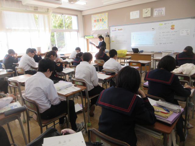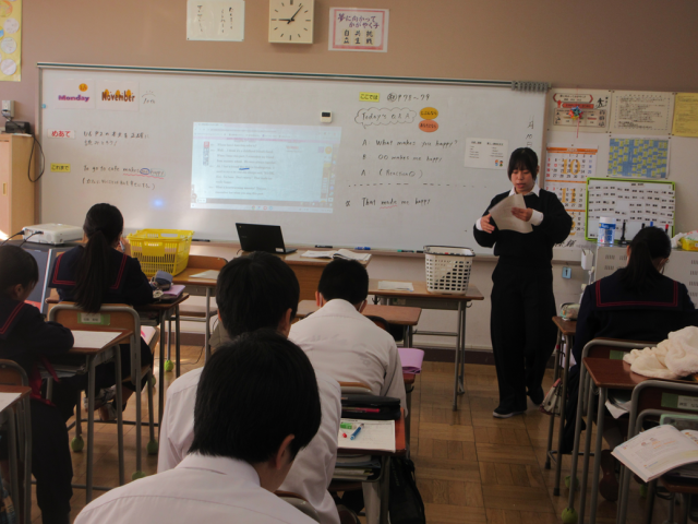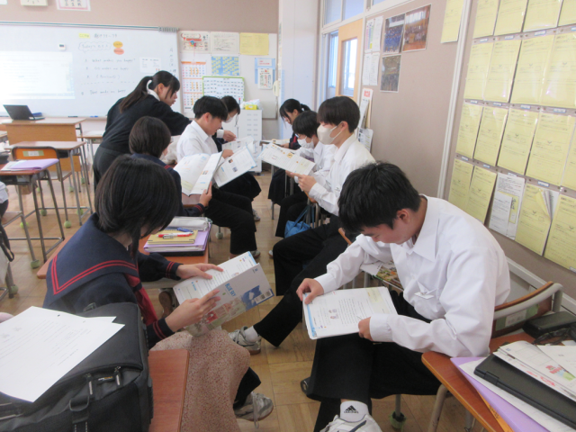11月10日(月)授業の様子(2年2組 英語) 公開日 2025/11/10 更新日 2025/11/10 できごと 教科書の本文読解を行いました。本文を読み取った後、友達と役割分担をしながら会話の基礎的なフレーズを身に付けています。