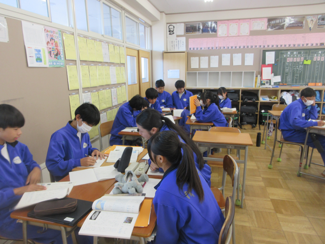11月10日(月)授業の様子(2年1組 国語) 公開日 2025/11/10 更新日 2025/11/10 できごと 論説文「モアイは語る」を通して、文章の構成や論理の展開について学んでいます。意見を裏付けるための、適切な根拠のあり方について各自で考え、班で意見を交流しました。筆者の主張をしっかり読み取ることができました。
