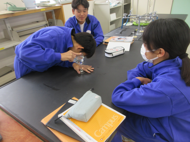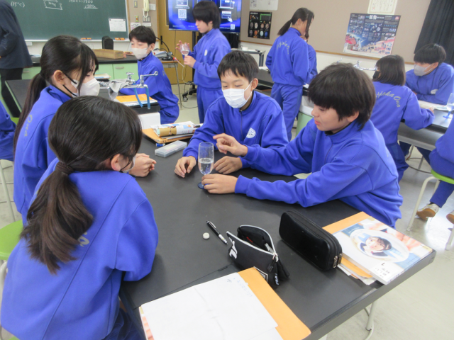 11月13日(木)授業の様子(1年2組 理科) 公開日 2025/11/13 更新日 2025/11/13 できごと 音について学習しています。水を入れたワイングラスのふちを濡れた手でこすると音が発生する現象を見ながら、音の仕組みについて考えました。