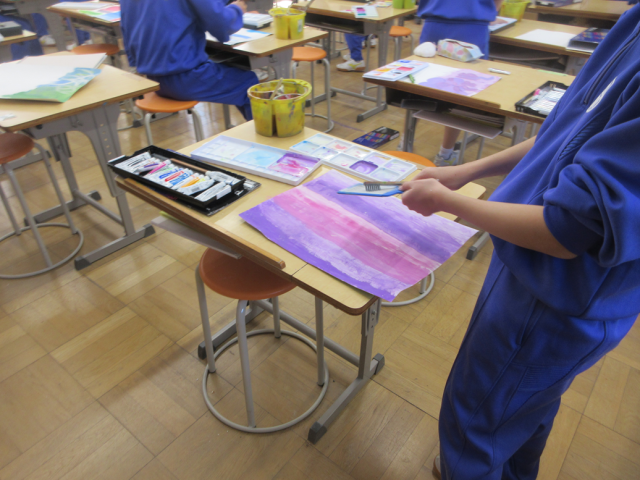 11月28日(金)授業の様子(1年3組 美術) 公開日 2025/11/28 更新日 2025/11/28 できごと 「世界にひとつだけの花」の制作が進んでいます。花を形作る紙の両面に色をつけてました。色の塗り方にも工夫が見られ、明るく華やかな「世界でひとつだけの花」が出来上がりそうです。 +1