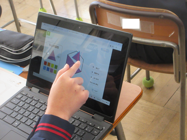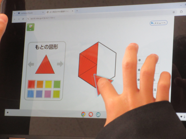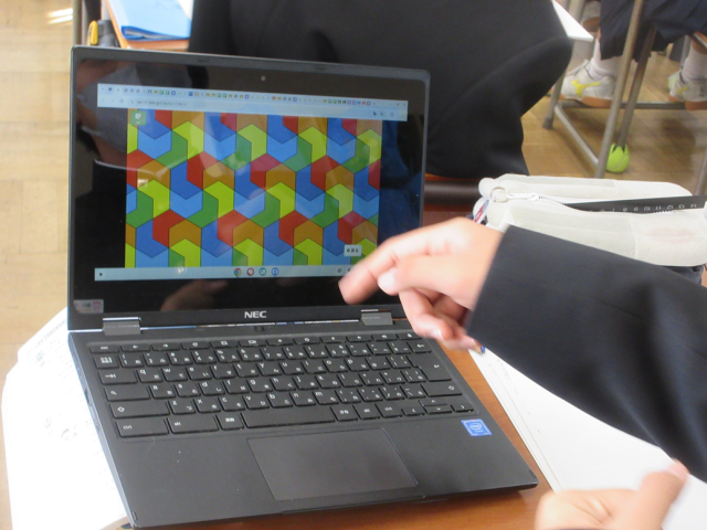 図形の学習です。合同な図形を敷き詰めることでできる模様をデザインしました。もとになる図形を決めて、それと合同な図形を並べ、正六角形の中に模様をつくりました。柔軟な発想で、様々な模様を作り出していました。