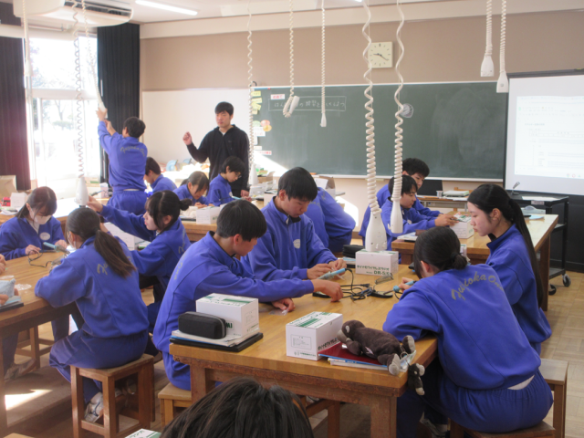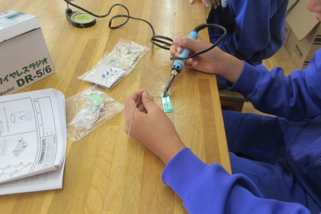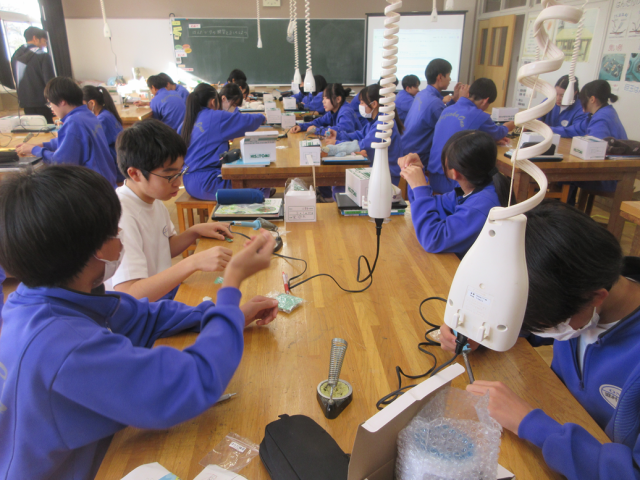 12月1日(月)授業の様子(2年1組 技術科) 公開日 2025/12/02 更新日 2025/12/02 できごと これからダイナモラジオ(ハンドルを回してラジオやライトが使用できる電池不要ラジオ)の制作に入ります。先ずは、はんだ付けの説明と練習を行いました。皆、火傷に注意し、真剣にはんだごてを握っていました。