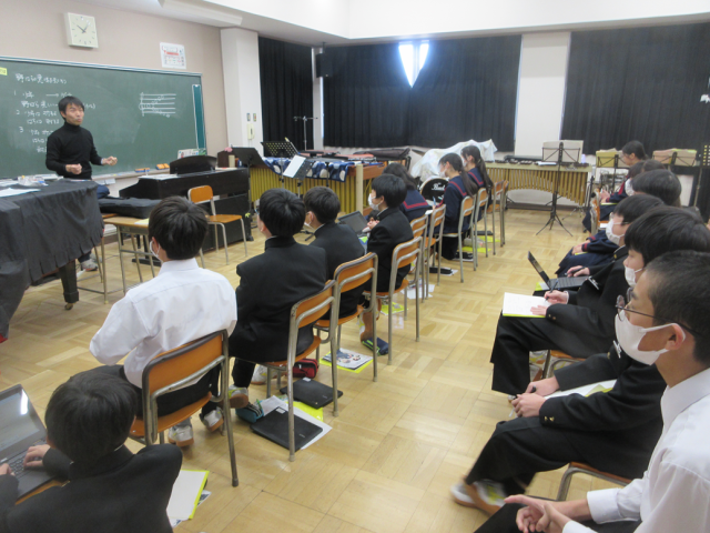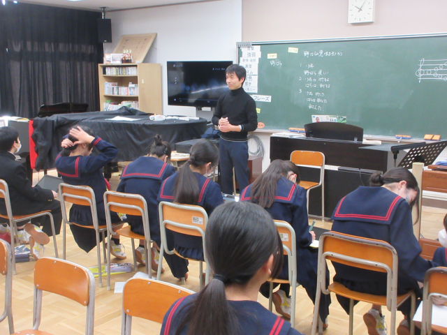 12月4日(木)授業の様子(1年1組 音楽) 公開日 2025/12/04 更新日 2025/12/04 できごと ゲーテ作詞、シューベルト作曲の「野ばら」について、歌詞の秘められた意味を想像しました。登場人物の恋の行方に興味をもち、たくさんの考えを交流することができました。