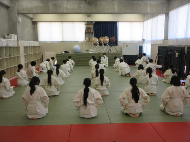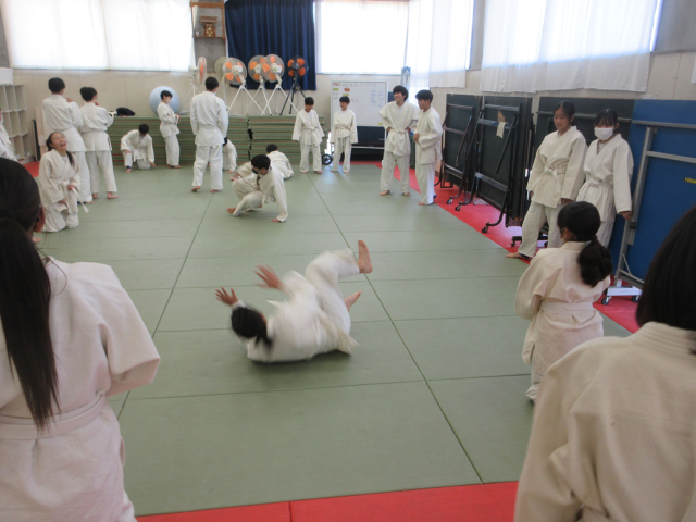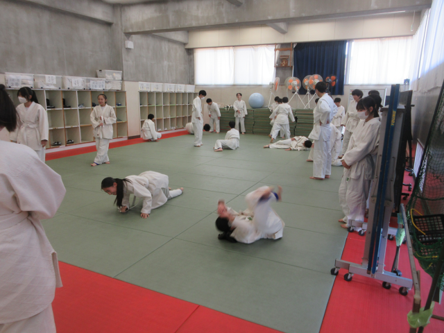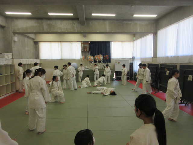 12月4日(木)授業の様子(1年2組 体育) 公開日 2025/12/04 更新日 2025/12/04 できごと 柔道の授業が始まりました。現在、受け身の練習を行っています。前受け身、横受け身、後ろ受け身、前回り受け身の基本4動作を行っています。男女共に積極的に練習を行っているので、前回り受け身も上手になってきました。 +1