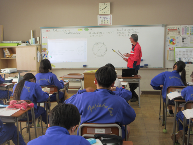 12月11日(木)授業の様子(1年2組 数学) 公開日 2025/12/11 更新日 2025/12/11 できごと 定規とコンパスだけで正六角形を作図してみました。皆、上手に作図することができました。作図の後、正六角形ができる理由を考えました。これからコンパスを使った作図の学習が始まります。