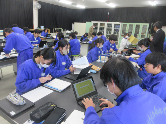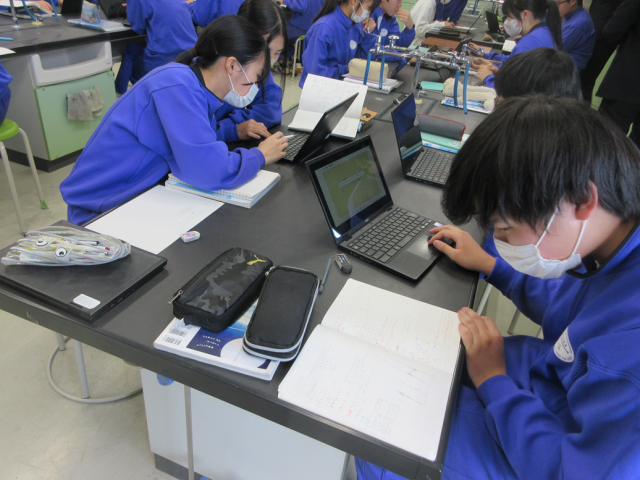 単元を通しての振り返りを各自、タブレットPCで行いました。ノートを見返しながらまとめる生徒、実験を行いながらまとめる生徒、教科書で確認しながらまとめる生徒等々、主体的に振り返りを行う姿が見られました。