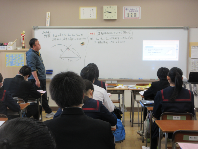1月14日(水)授業の様子(3年2組 数学) 公開日 2026/01/14 更新日 2026/01/14 できごと 三平方の定理の逆を使って、三角形が直角三角形になるか調べました。直角三角形では斜辺がいちばん長いということに着目して、三平方の定理に結び付けていきました。問題を解きながら、三平方の定理について理解を深めています。