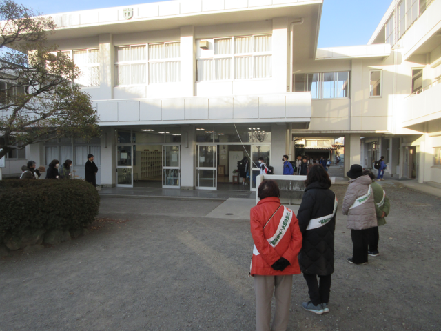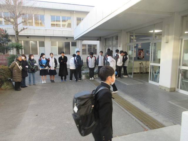1月15日(木)あいさつ運動(更生保護女性会の皆様) 公開日 2026/01/15 更新日 2026/01/15 できごと 本日、更生保護女性会小野支部の皆様がご来校くださり、生徒たちとあいさつ運動を行いました。凍えてつくような寒い朝でしたが、一人一人の生徒に丁寧にご挨拶くださり、生徒たちも気持ちよくあいさつを交わしていました。一日のスタートにふさわしく、温かい雰囲気に包まれていました。