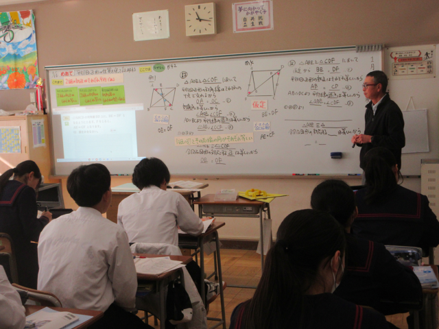1月16日(金)授業の様子(2年3組 数学) 公開日 2026/01/16 更新日 2026/01/16 できごと 平行四辺形の性質を使って証明問題を解きました。三角形の合同条件や錯角、対頂角など、今まで学習したことを活用しながら証明していきます。支援員の先生に助言してもらったり、友達と教え合ったり、粘り強く証明問題に向き合っていました。 +1