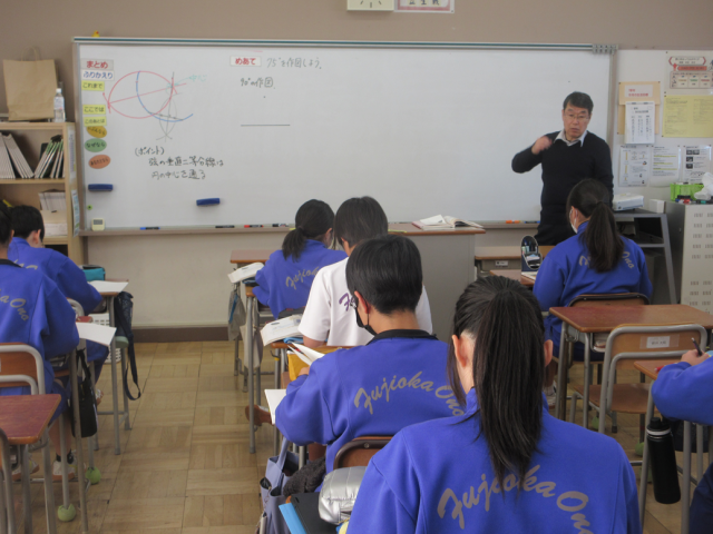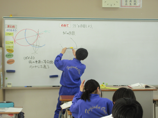 1月20日(火)授業の様子(1年1組 数学) 公開日 2026/01/20 更新日 2026/01/20 できごと 今日の数学は、非常勤講師の先生に教えていただきました。角度75°の作図に挑戦しました。既習の学習を応用しながら、見事に作図することができました。