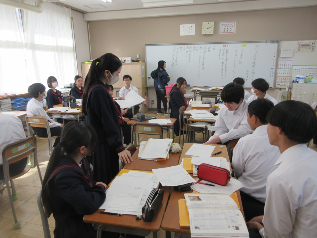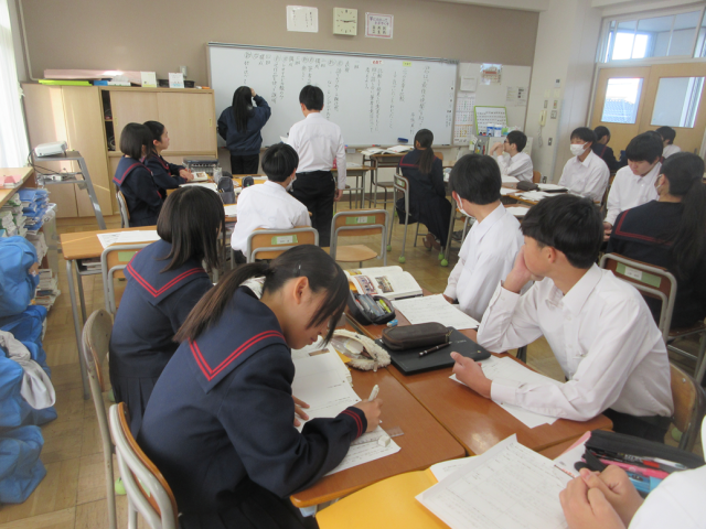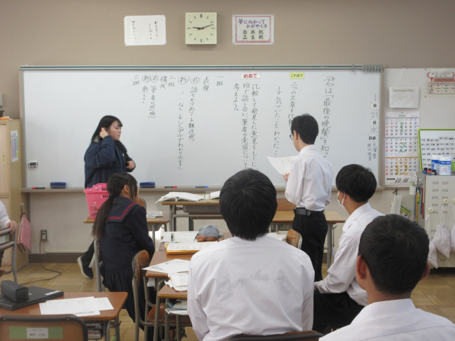 1月21日(水)授業の様子(2年1組 国語) 公開日 2026/01/21 更新日 2026/01/21 できごと 「君は『最後の晩餐』を知ってるか」という評論文を教材に学習しています。今日は、筆者が工夫を凝らして文章を書いた意図について、班で話し合いました。しっかり意見交流が行われ、班ごとに違った視点で発表がありました。本教材は藤岡市出身で美術批評家である布施英利さんが書いたものです。 +1