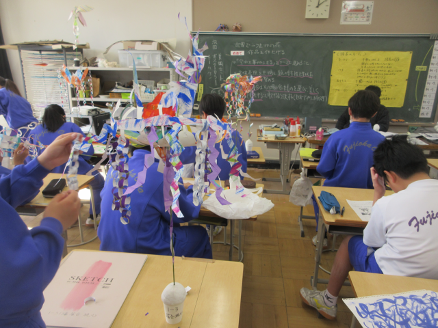 2月6日(金)授業の様子(1年3組 美術) 公開日 2026/02/07 更新日 2026/02/07 できごと 「世界にひとつだけの花」という題材で、自分だけのオリジナルの花を紙で作っています。完成した作品は、南校舎2階に展示してあります。今月末の授業参観にお越しの際は、是非ご覧ください。 +1