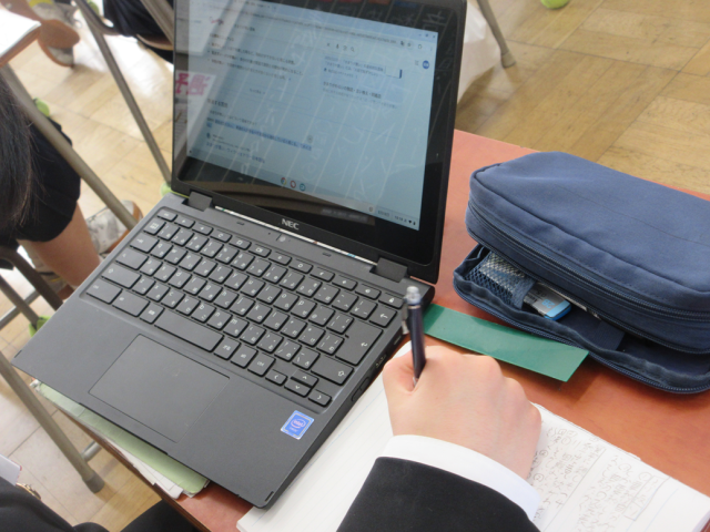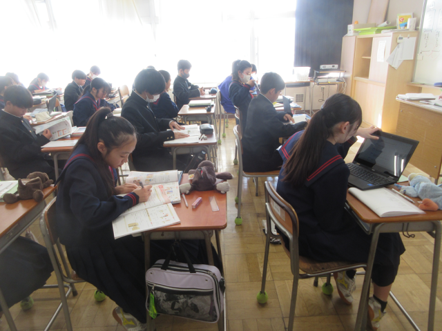 漢字、慣用句の学習です。漢字は「 様子・気持ち」「 自然」「 学校生活」などに用いる言葉を書き、漢字の習得が語彙力の向上につながるよう繰り返し練習しています。慣用句は、タブレットPCで意味や使う場面等を調べ、教科担当に提出していました。