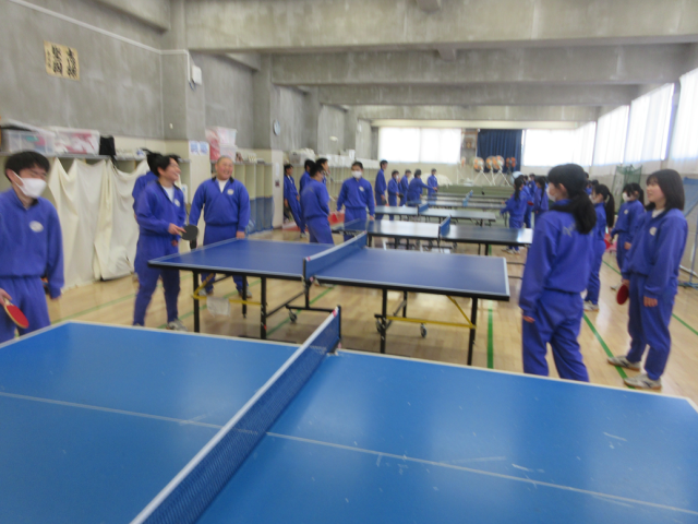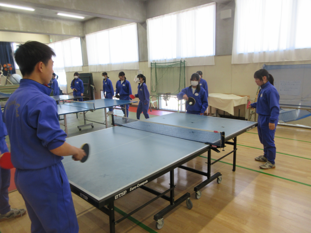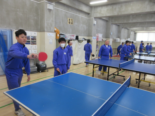 2月13日(金)授業の様子(3年1組 体育) 公開日 2026/02/13 更新日 2026/02/13 できごと 卓球の授業です。「フットワークを使って打つ」をめあてに練習を行っています。1分間ラリーが続くよう練習しましたが、なかなか難しいようでした。コツをつかんだ生徒も多く、少しずつ上達しています。 +1