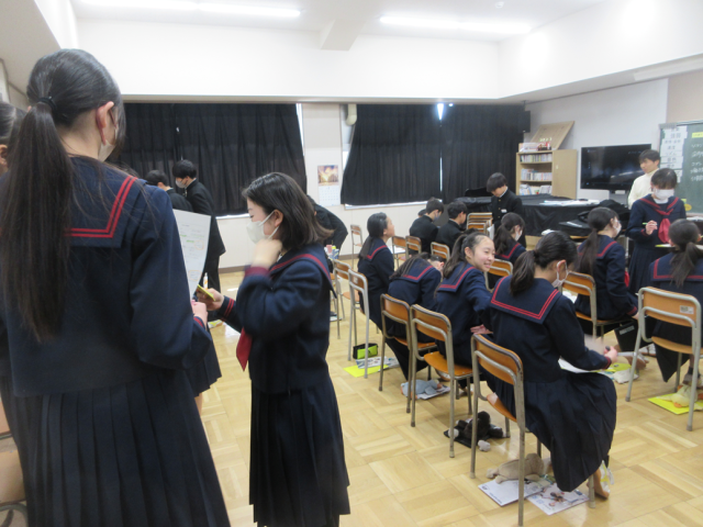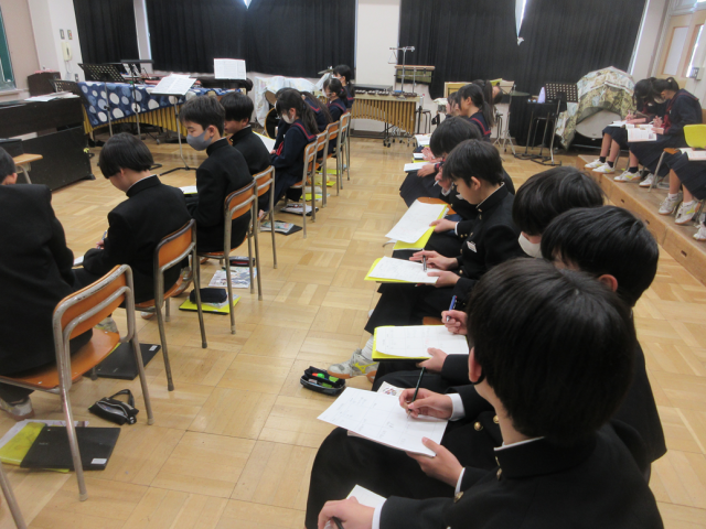 2月16日(月)授業の様子(1年2組 音楽) 公開日 2026/02/16 更新日 2026/02/16 できごと 日本の民謡の鑑賞を行っています。声の音色、節回しやリズムの特徴などに気をつけながら、日本の民謡の良さや美しさを味わって聴きました。今日は沖縄の谷茶前(たんちゃめ)という踊り歌を鑑賞しました。三線を用いた琉球特有のリズムで、生徒はたくさんの感想を交流し合っていました。