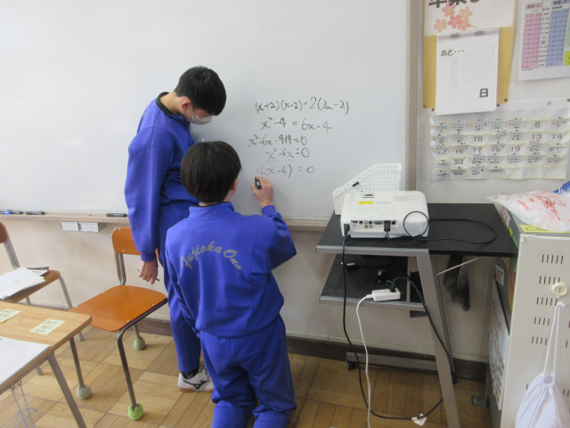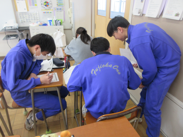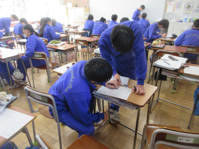 群馬県公立高校入試前日、数学の入試対策プリントに取り組み、明日の入学試験に備えています。分からない問題を数学担当に聞いたり、友達と教え合ったりしながら、最後の確認を行っていました。