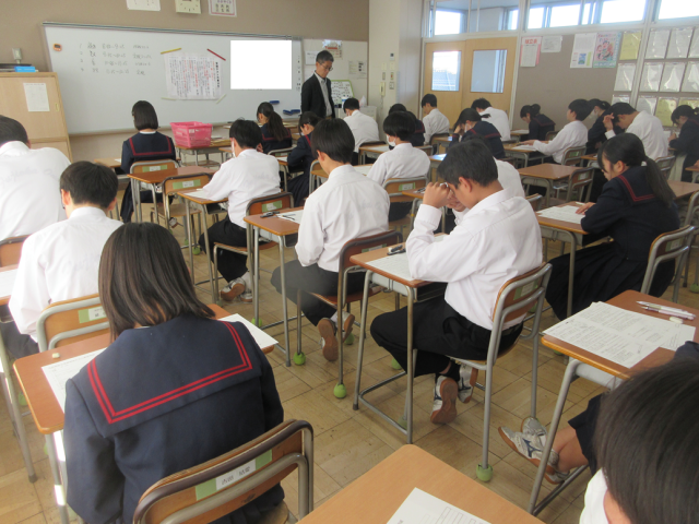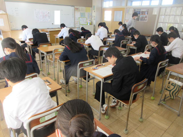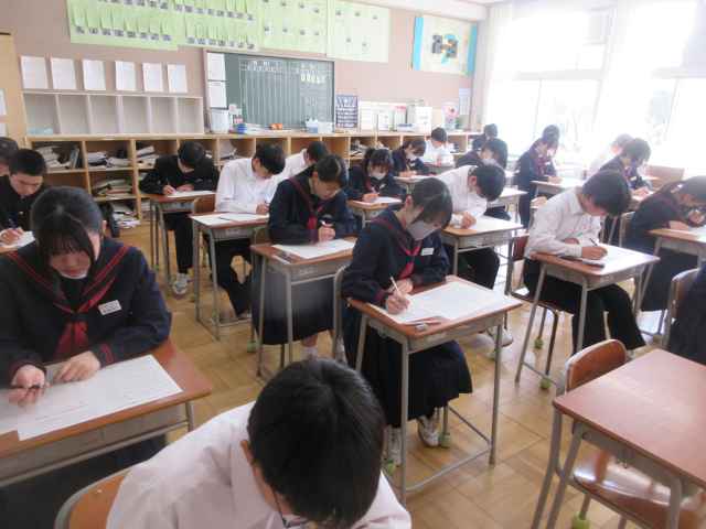 期末テスト2日目は、保健体育、数学、音楽、理科の4教科でした。どのクラスもテスト直前までノートやワークを見て、既習事項の確認をしていました。写真は、保健体育の様子です。(上から2年1組、2年2組、2年3組)