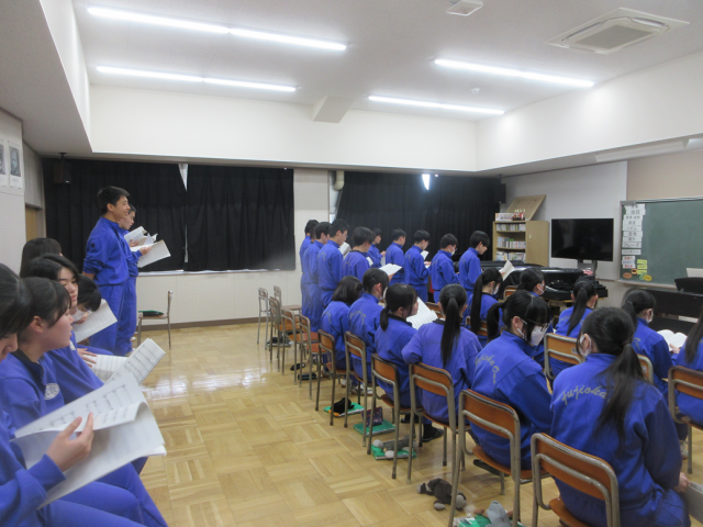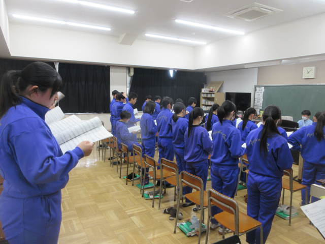 2月24日(火)授業の様子(3年1組 音楽) 公開日 2026/02/24 更新日 2026/02/24 できごと 音楽の授業も数えるほどになりました。今は卒業式の卒業生合唱の練習を行っています。今年の卒業合唱は「正解」です。学校生活の日常が詰め込まれた歌詞で、次のステージに踏み出す3年生にぴったりな曲です。歌詞に感情を込めながら歌っている様子が印象的でした。