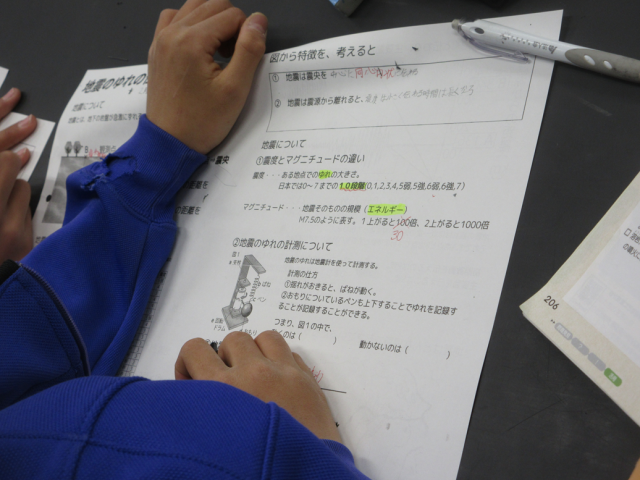 地震のゆれの特徴や計測方法について学習しています。地震計の仕組みと計測記録からわかることを資料を見ながら考えました。
