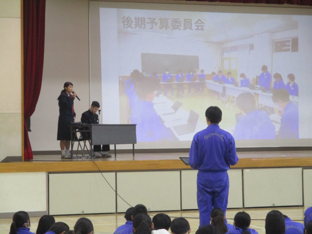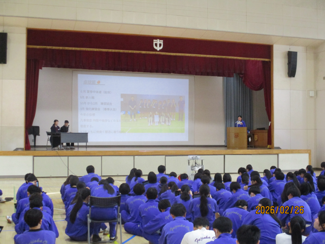 2月26日(木)生徒総会 公開日 2026/02/27 更新日 2026/02/27 できごと 6校時に生徒総会が開催されました。令和7年度の生徒会諸活動について、2年生を中心とした生徒会本部、各委員会委員長、部長が報告を行いました。厳粛な雰囲気のなか、学校生活の諸課題について、自分たちで考え、自分たちで改善しようとする雰囲気が伝わってきました。小野中学校での生活が充実したものとなるよう、今後も生徒みんなで力を合わせて、生徒会活動に取り組むことを期待しています。