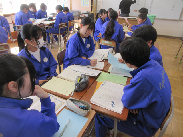 2年3組も班で役割を決めながら、「走れメロス」を読み深めています。自分の役割がしっかり決まっているので、生徒は班のメンバーと活発に交流をしながら、考えや内容を伝えあっていました。