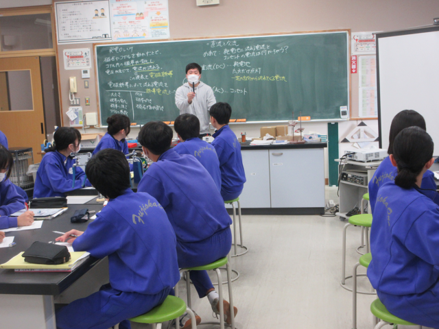 電流の学習です。乾電池に流れる電流とコンセントの電流の違いについて考えました。発光ダイオードを用いて、違いを観察しました。点灯の様子から、特徴の違いがよくわかりました。