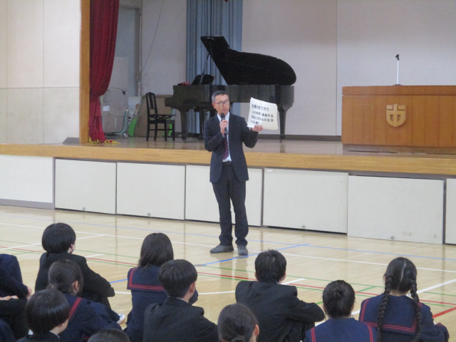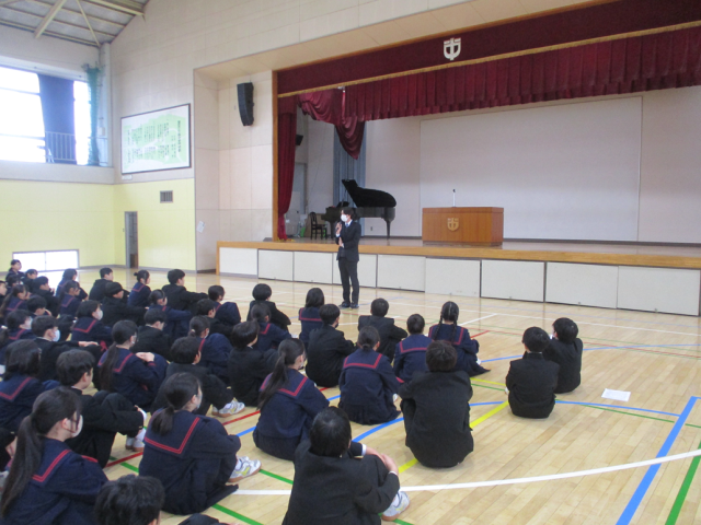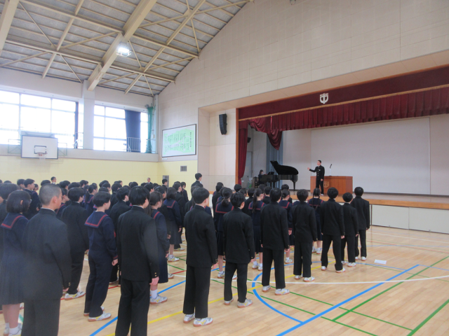 3月26日(木)令和7年度修了式 公開日 2026/03/26 更新日 2026/03/26 できごと 令和7年度の修了式が行われました。まず、1、2年生の代表生徒に修了証が渡されました。一足早く卒業した3年生に負けずに、1、2年生も今年一年で大きく成長することができました。年度末休業中も部活動はありますが、令和7年度の授業日はこれで最後となります。保護者や地域の皆様には大変お世話になりました。 +2