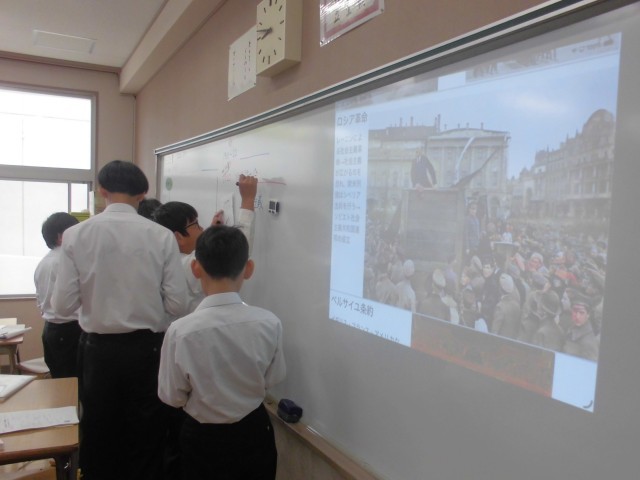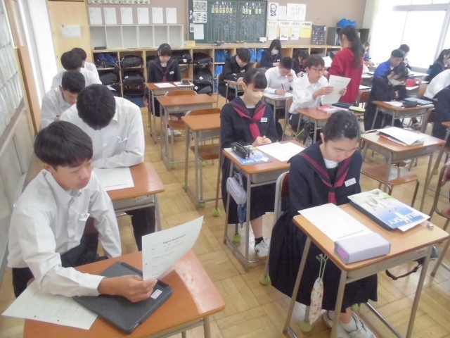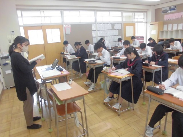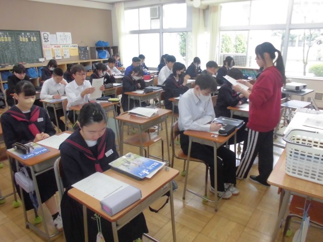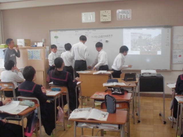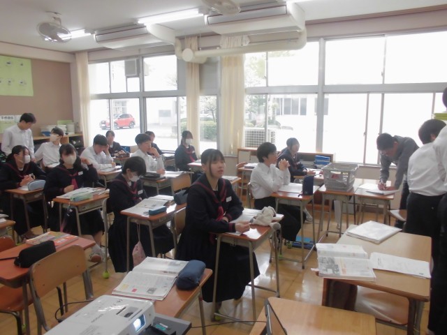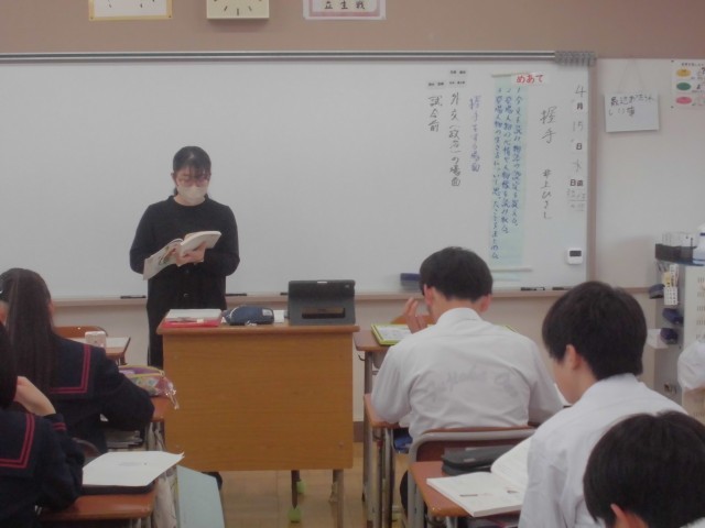 4月15日(水)3年生 国語・英語・社会 公開日 2026/04/15 更新日 2026/04/15 できごと 国語では先生の範読を聞いている場面、英語では新出の表現を先生の後に続いて発音している場面、社会ではネームプレートを活用し、自分の調べた内容を板書している場面でした。 +7
