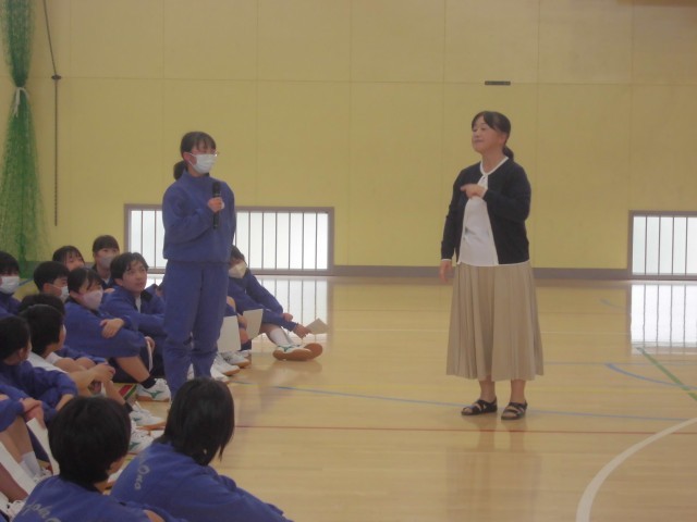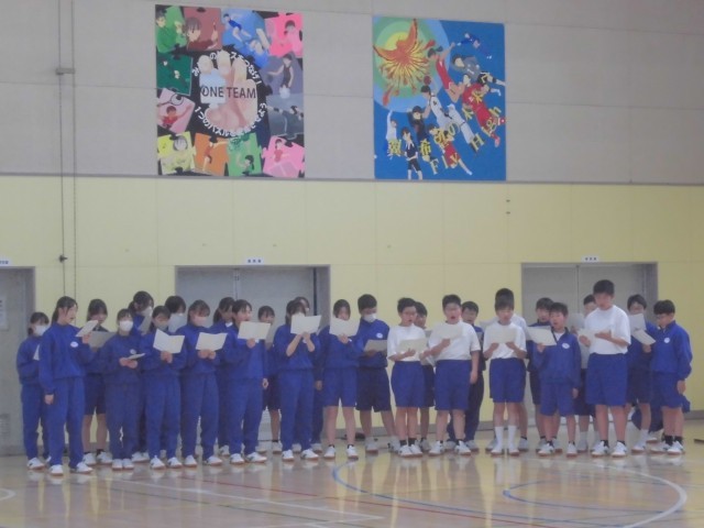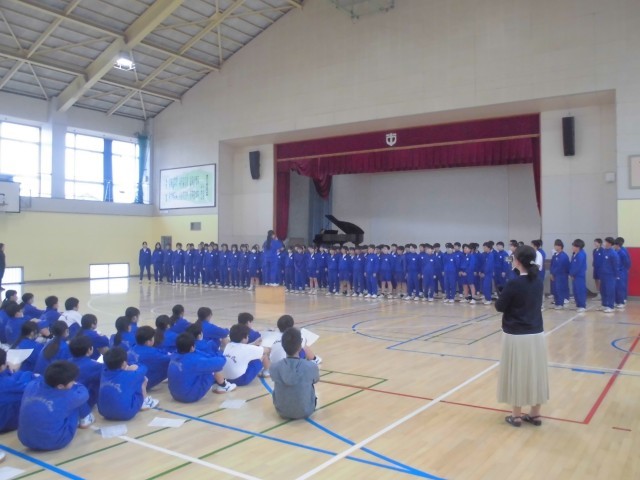2年生が1年生に校歌を教えます。効果的に教える為に、2年生は作戦会議もしてあります。最後は1年生がクラスごとに校歌を発表し、先生たちが大きな声だったか?自信をもっているか?を評価しました。こうやって伝統が引き継がれていくことが文化だと改めて実感することができました。