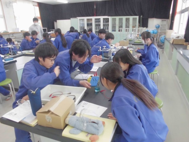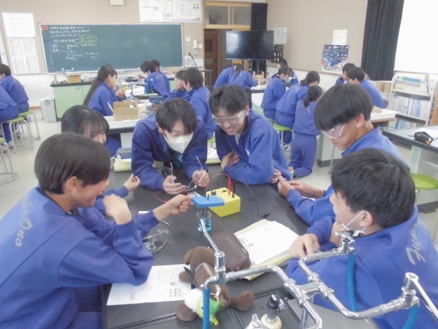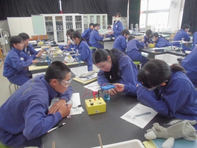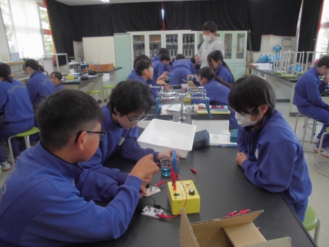 数学は公式通りに数字を当てはめて計算するようす、英語はペアで会話するようす、理科は塩化銅水溶液の電気分解の実験です。