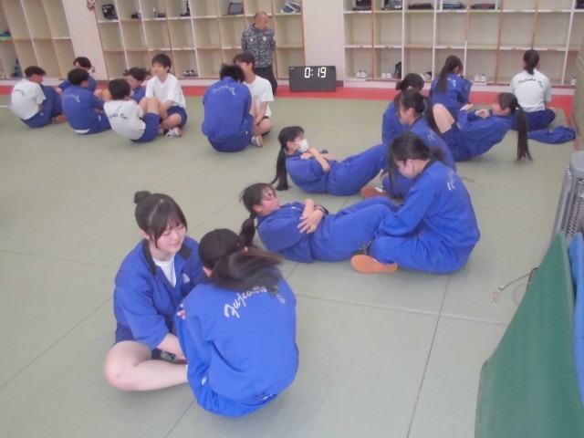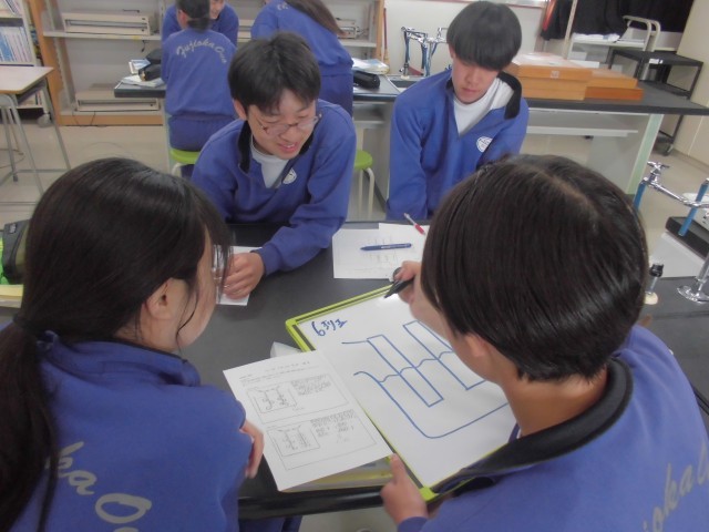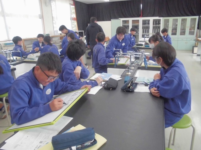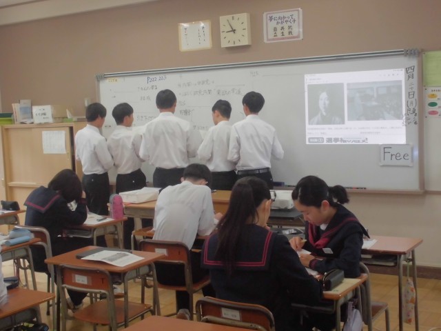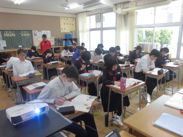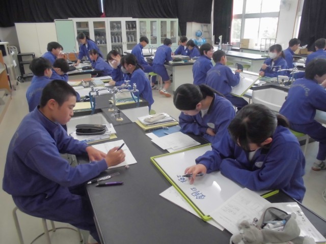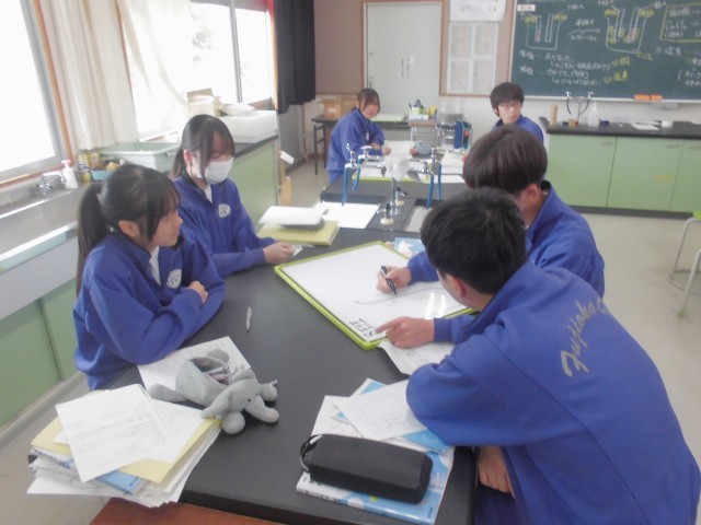 体育では体力テストの腹筋を、社会では選挙権について学習を深め、理科では塩化銅水溶液の電気分解について班ごとにまとめています。