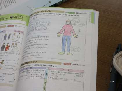5月 2日(木)授業の様子(1年2組 家庭科) 公開日 2024/05/02 更新日 2024/05/02 できごと 目的に応じた衣服の選択について考えました。着ていく場面を自分で設定し、イラストで衣服や小物を表現しました。皆、カラフルで素敵なコーディネートに仕上げていました。