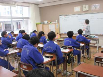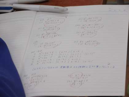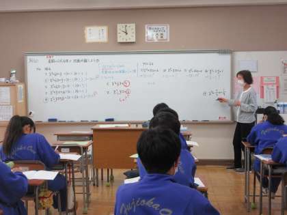前時と違う展開の公式を使い、因数分解を解きました。さすが3年生。質問に対して活発に発言していました。