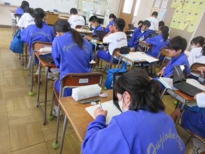 5月 7日(火)授業の様子(1年2組 国語) 公開日 2024/05/07 更新日 2024/05/07 できごと 西加奈子作「シンシュン」を教材に読解を行っています。登場人物である、シュンタとシンタの関係の変化をよみとりました。タブレットPCを用いて、考えを交流しながら、より深く読み込んでいきました。