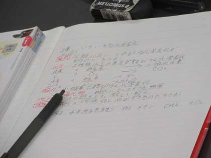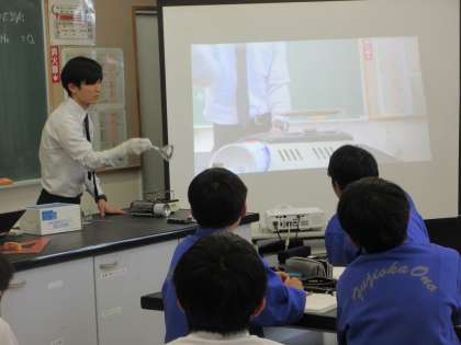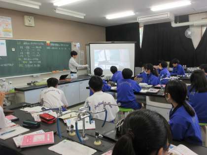 化学変化について学習しています。有機物が燃焼するとなにができるか、考察しました。例としてメタンを燃焼させ、できた物質を確認しました。演示実験でしたが、興味深く燃焼の様子と結果を見ていました。