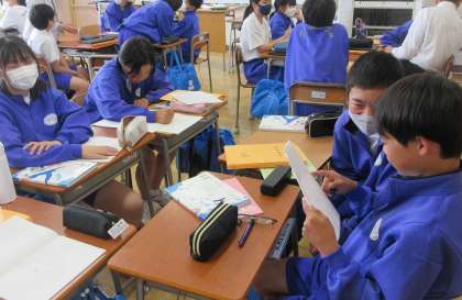 5月13日(月)授業の様子(1年2組 国語) 公開日 2024/05/13 更新日 2024/05/13 できごと 少年の主張の班代表を決めています.お互いの主張を班で聞き合い、よかった点を明確にして、根拠をもって代表を決めることができました。